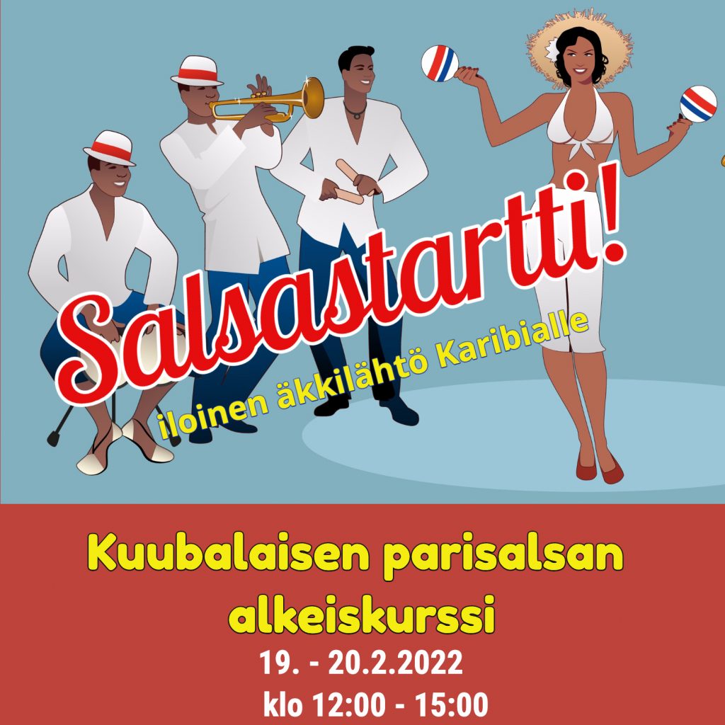 Opit tärkeimmät askeleet ja muutamat kuviot, joita yhdistelemällä pääset jo tanssilattialle parisi kanssa salsatanssin tunnelmiin! Mikäli kiinnostut eli se kuuluisa ”salsakärpänen puraisee”, voit jatkaa harrastusta seuran alkeis- tai alkeisjatkotason tunneille. Tanssittava tyyli on kuubalainen parisalsa, joka sopii kaikenikäisille. Kurssia vetävät Virpi Salo ja Tapio Kautto.